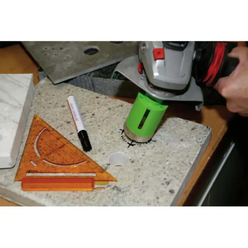 Kietų plytelių, akmens masės, plono granito ir keramikos skylėms valyti. Puikūs rezultatai naudojant kietas medžiagas. Didelis apskritimo greitis, pasiekiamas naudojant kampinį šlifuoklį, leidžia gręžti be vandens aušinimo.