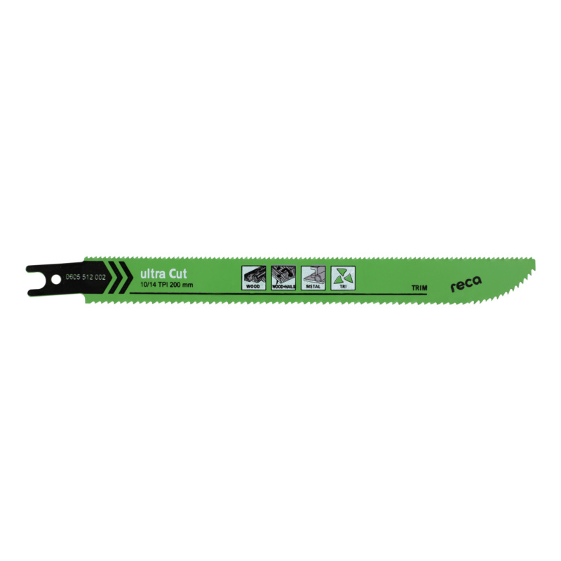 Novatoriška tiesinio pjūklo geležtė , pagaminta iš trimetalio, atveria naujas darbo galimybes, su 10/14 dantų colyje . Dantytas galas leidžia lengvai pjauti visas medienos medžiagas. Dvi skirtingai dantytos briaunos leidžia vienodai efektyviai dirbti su medžiu ir metalu, taip pat su mediena su vinimis. Specialus velenas leidžia pasukti ašmenis kardo pjūklo geležtės laikiklyje. Su šiuo peiliuku taip pat galima dirbti „iš apačios į viršų“, o tai gali būti labai naudinga funkcija kai kuriose darbo situacijose. Labai patvarus ir ilgas tarnavimo laikas. Dantų konstrukcija: frezuotas ir šoninis komplektas